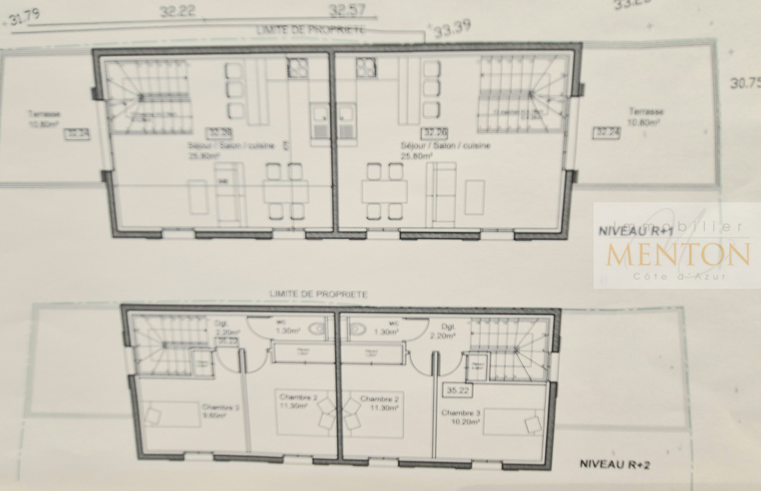 Sur la commune de Menton, vallée du Borrigo , projet de construction avec un permis accordé et purgé, pour la réalisation de deux maisons mitoyennes en copropriété, composée chacune : Au niveau 0 : Une chambre, une salle d'eau , une kitchenette un garage d'une surface de 13 m2. Au niveau 1 : Salon- salle à manger - cuisine. Au niveau 2 : Deux chambres Soit une surface totale de 70 m2 environ pour chacune des maisons. Un jardinet , accès direct Ce bien est idéal pour une famille en résidence principale , ou une résidence secondaire, les écoles sont à proximité, ainsi qu'un supermarché.