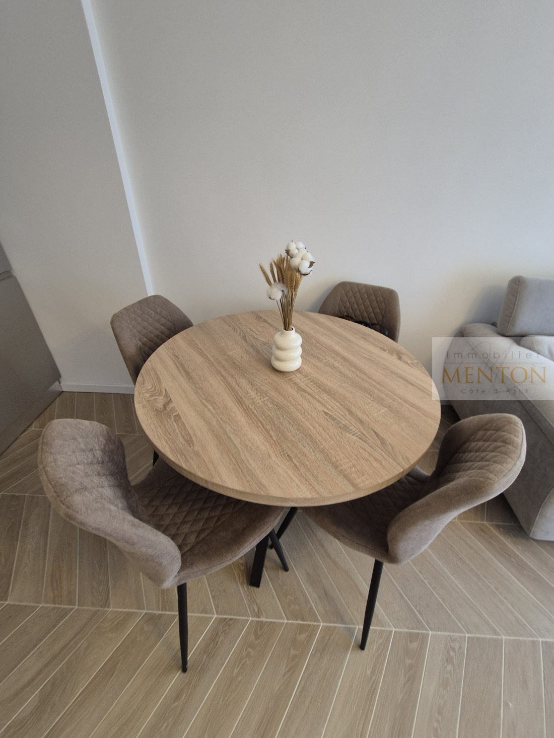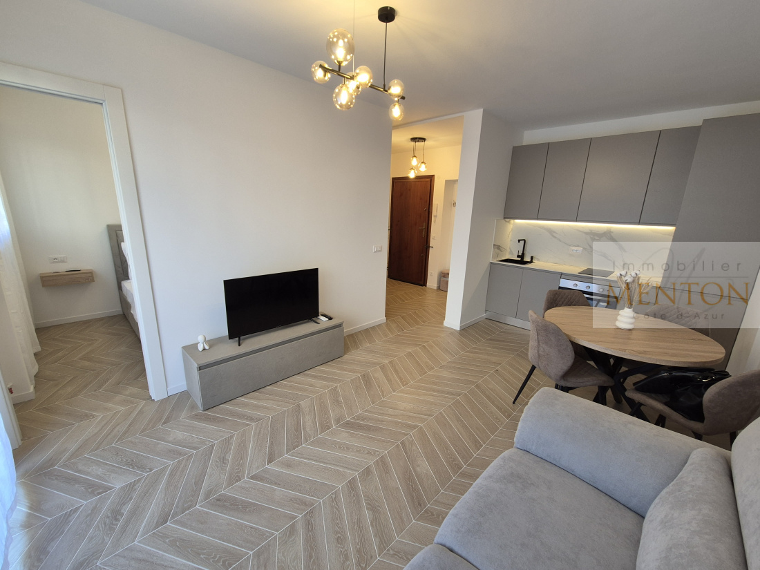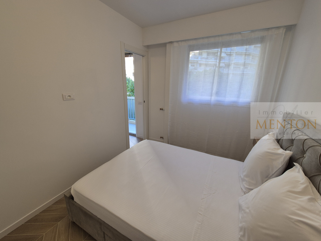 Menton, à 100 m des jardins bioves, ce magnifique 2 pièces entièrement rénové, 100% design, vendu meublé. A noter le calme en centre ville. L 'appartement bénéficie d 'une terrasse en trame large, donnant sur séjour et chambre,, et surtout avec une belle vue parc et jardin. Nous sommes proche de tout, gare routière, sncf, le centre ville de menton, sommes à 600 m des plages. l 'appartement est climatisé, exposition est, au calme. sommes au premier étage, avec ascenseur, accés handicapé. 110 € de charges par mois, eau froide, chaude, chauffage inclus.