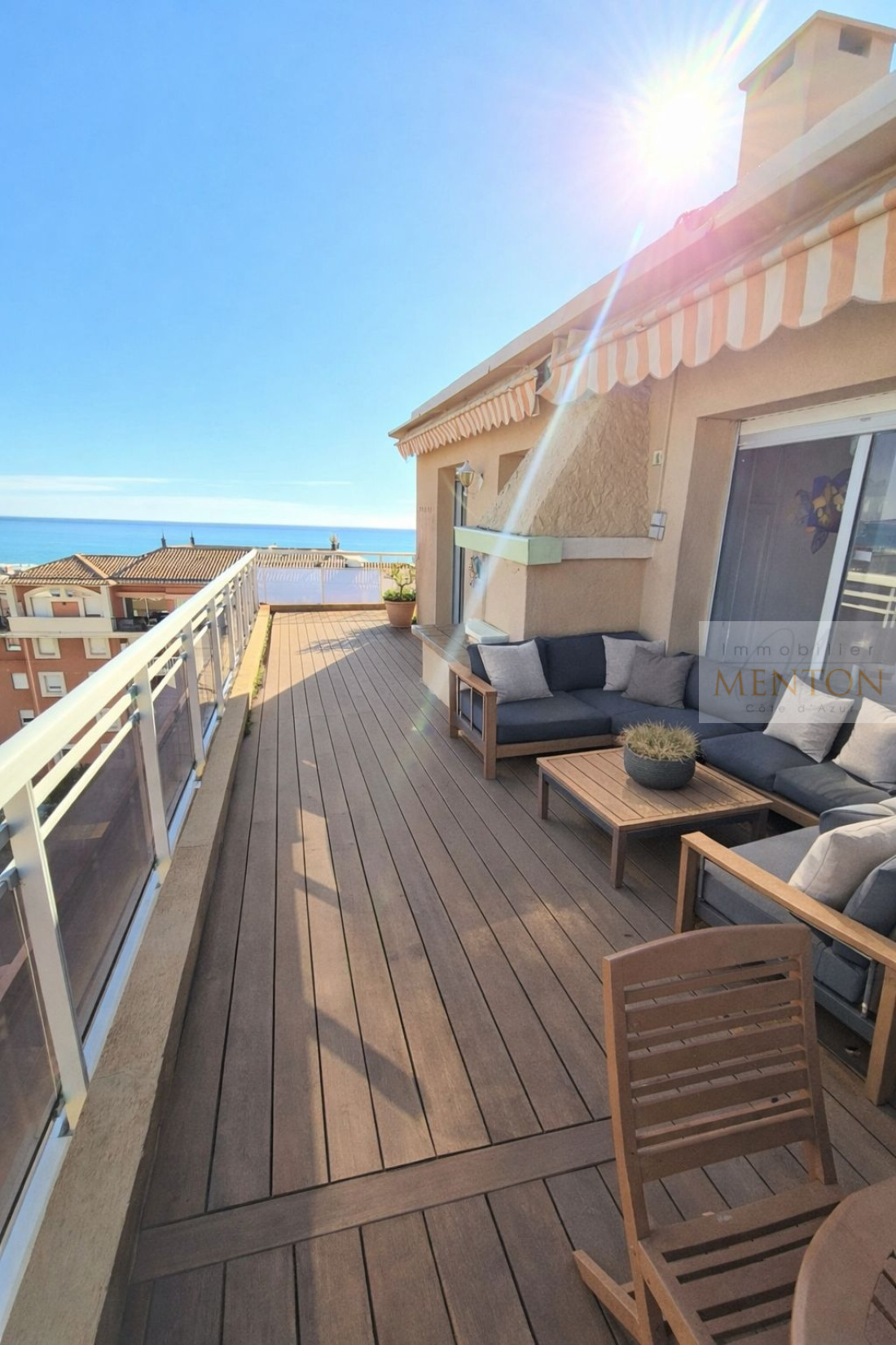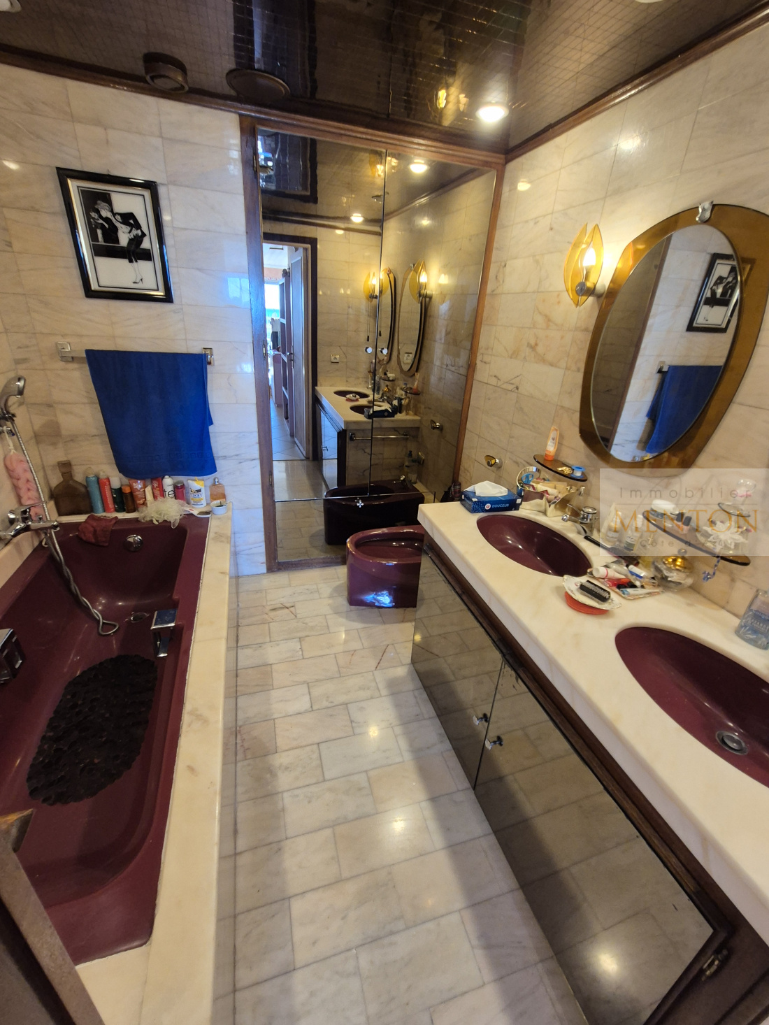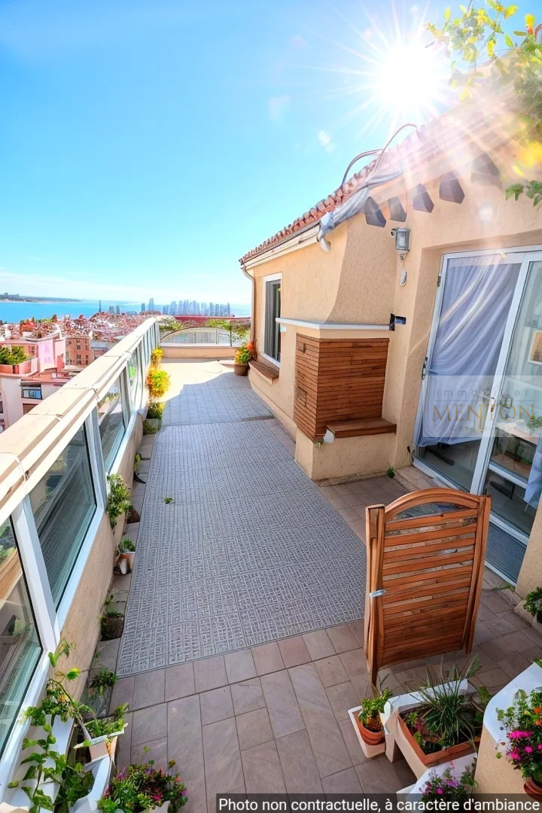 Menton à 30 m du bord de mer, coeur centre ville de menton ,cet appartement villa de 79 m² et de 63 m² de terrasse au 8ème et dernier étage d 'une belle résidence de standing à 30 mètres du front de mer. Seul quelques immeubles possèdent 8 étages sur Menton. Nous sommes donc sur un bien d 'exeption à l 'emplacement 5 étoiles.l 'appartement villa n' à donc aucun vis à vis, vue à 300 ° mer , montagnes,. Proche de tout, l' appartement se compose de: salle de bains et d’un WC indépendant. hall d’entrée, séjour , salle à manger , d’une cuisine séparée, de deux chambres, ,four à pizza sur terrasse. toutes les pièces donnent sur une terrasse formant un L de 63 m². Au niveau 0 de ce bel imeuble de standing, l 'appartement béneficie d'un parking et d 'une cave dans le prolongement de celui ci.